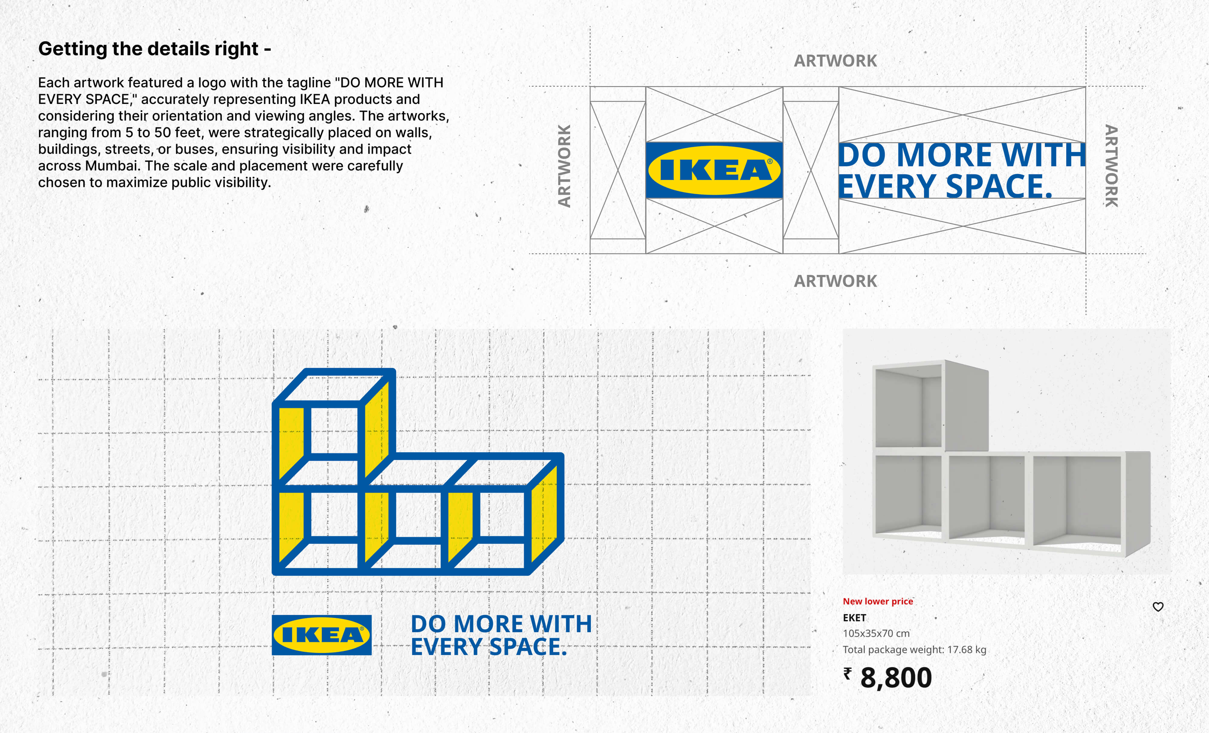 The campaign's artworks, featuring the slogan "DO MORE WITH EVERY SPACE," reinforced IKEA's message of space efficiency. The installations, ranging from small street corners to large building facades, ensured visibility and impact. Each piece accurately represented an IKEA product, maintaining visual consistency and appeal.