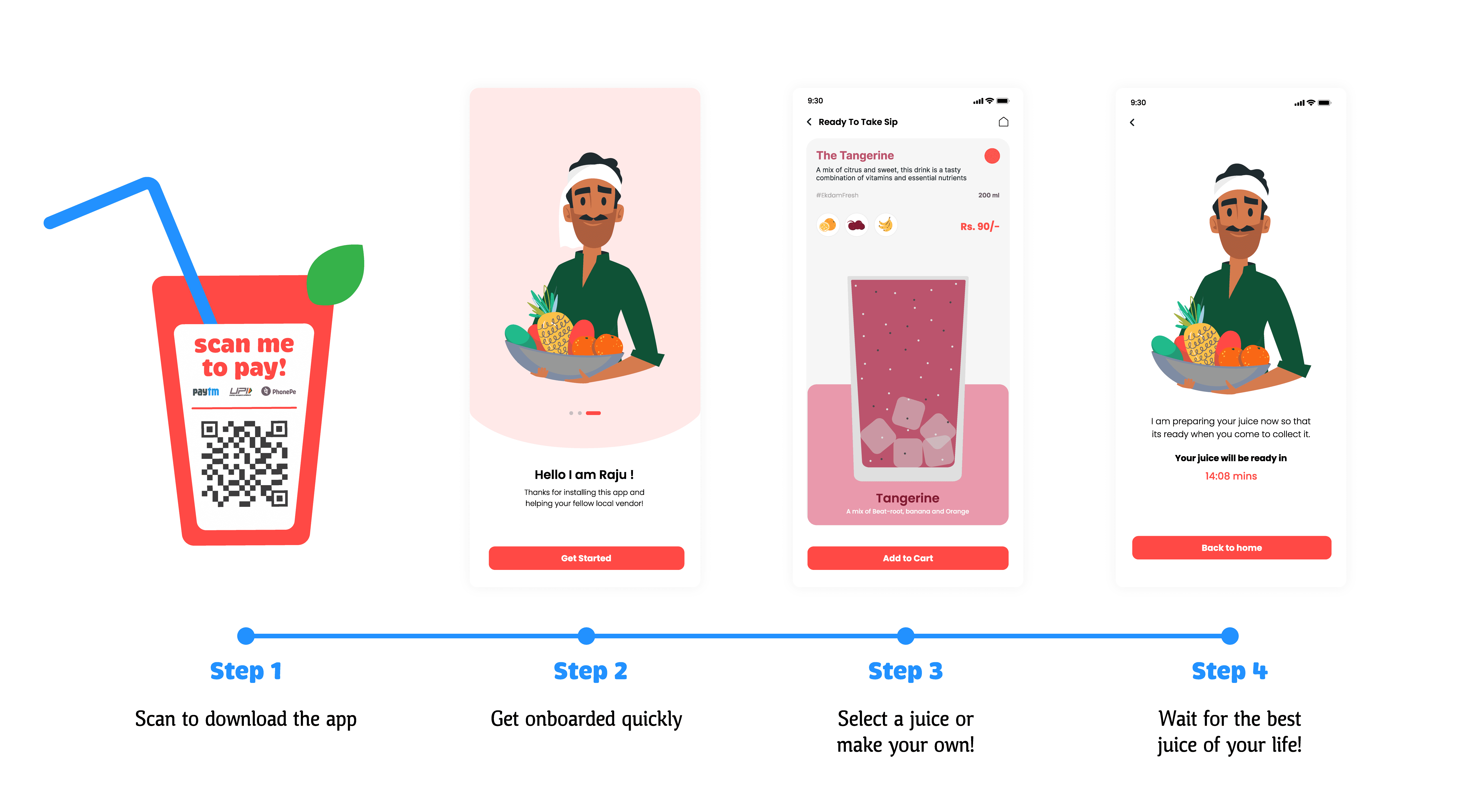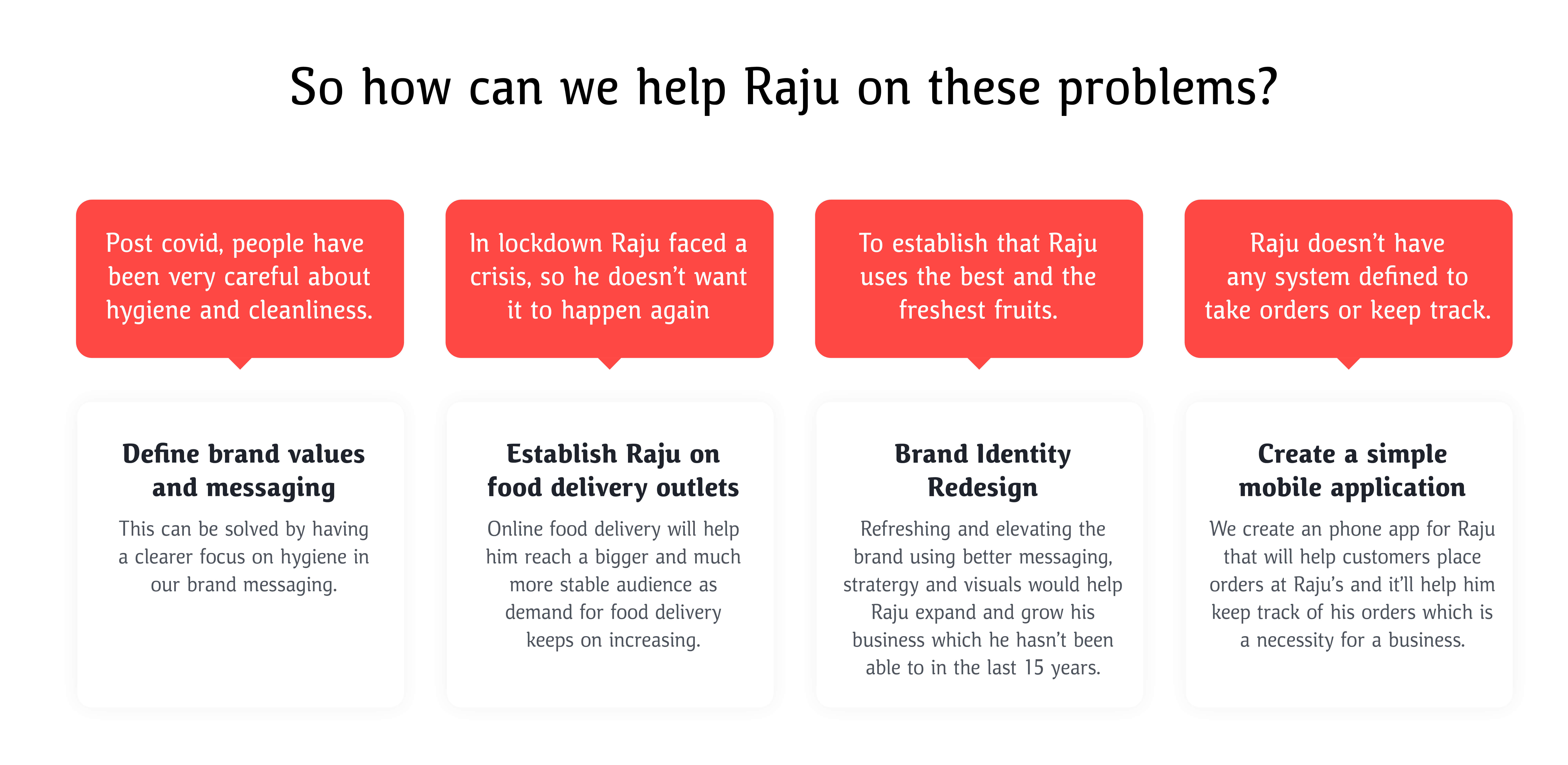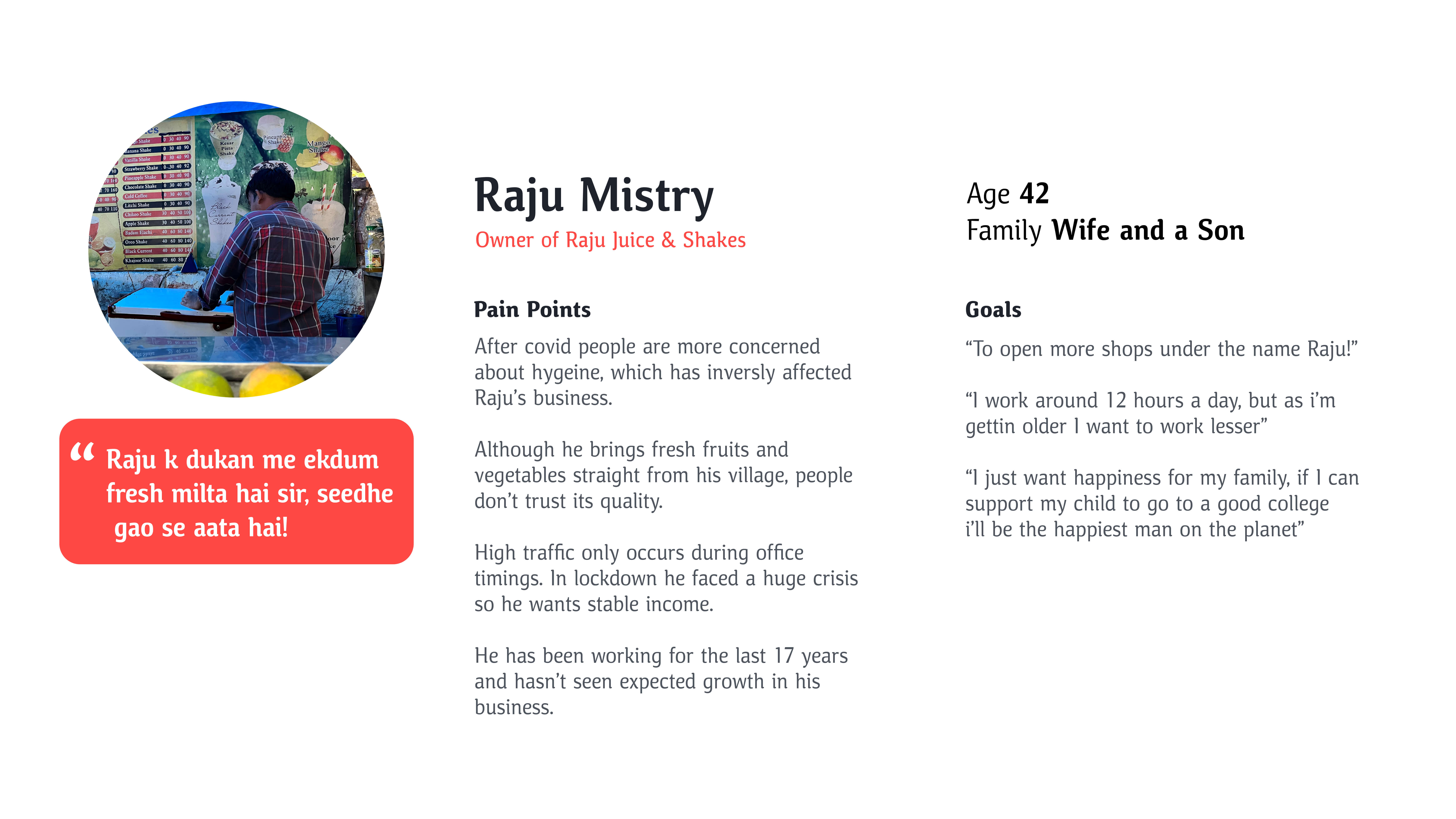 The goal was to design a solution for Raju that could help manage high traffic during peak times, establish trust in the quality of his products, and provide a stable income source by extending his reach beyond in-person visits through a brand identity and an interactive engagement.